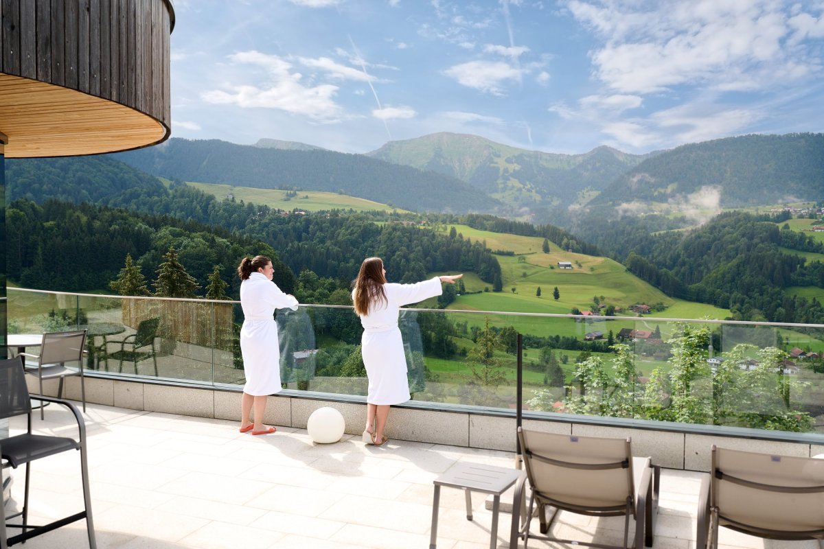 Das Erlebnisbad Aquaria erwartet Dich mit atemberaubendem Panoramablick auf die Bergwelt der Nagelfluhkette.